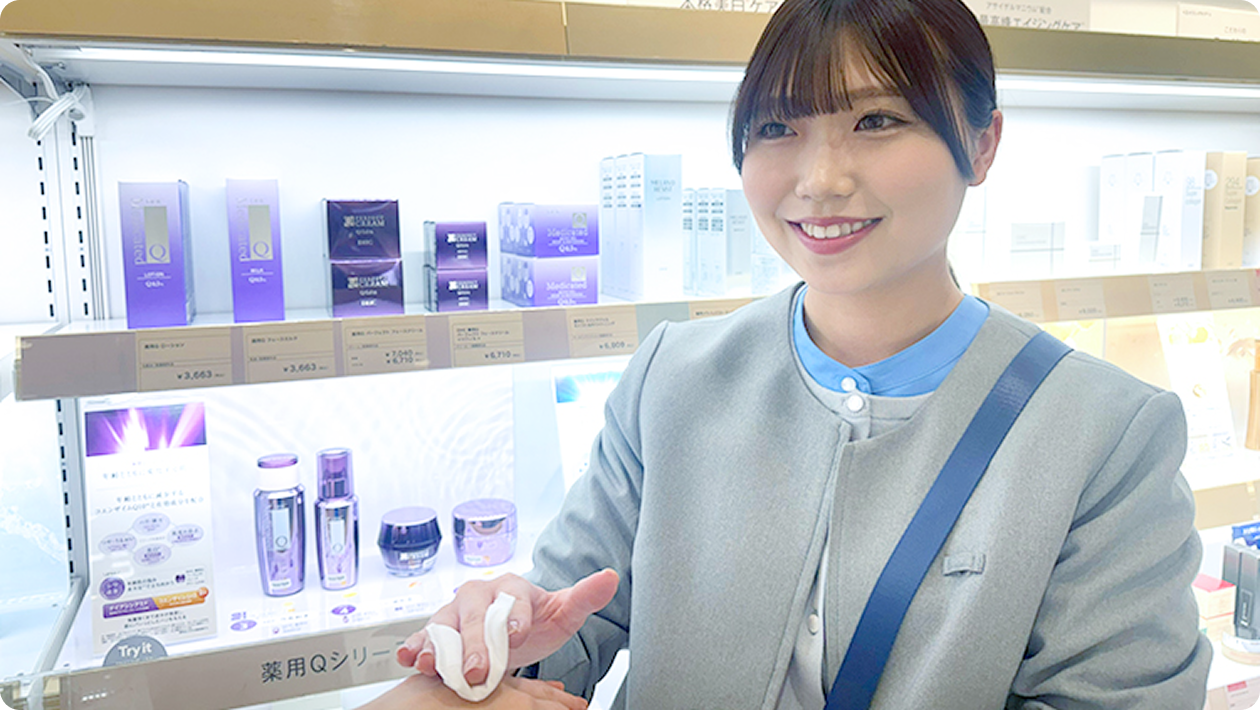 入社後は、美容や健康に関するお悩みに寄り添い、カウンセリングや肌測定、タッチアップを通して最適な商品提案を心がけています。以前、タッチアップを行った際にお客様が「メイクをしてもらって気分が上がったので、この後少し買い物をして帰ろうと思います!」と笑顔でお話しくださり、商品をご購入いただいたことがありました。その時、お客様の気持ちを前向きにするお手伝いができたことに大きな喜びを感じ、この仕事のやりがいを実感しました。