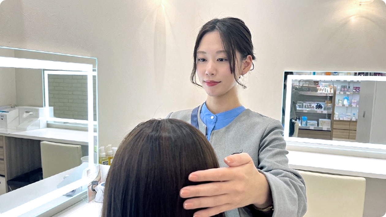年齢の異なるメンバーが集まっていますが、気遣いのできるスタッフばかりで、職場の雰囲気はとてもあたたかいです。お客さまに対してだけでなく、仲間同士でも思いやりを大切にしており、私が困ったときや迷ったときには、自然と支えてくれる頼もしい後輩がいます。そんな仲間には日頃から「ありがとう」を伝えることを大切にしています。また、他店へ応援に行く機会も多く、店舗を越えた交流ができるのも魅力のひとつです。出張応援で地方から来てくれたスタッフと休日に観光へ行ったこともあり、たくさんの仲間とつながれる環境だと感じています。最近は制服も新しくなり、ヘアアレンジなども楽しみながら、より自分らしく働けています。